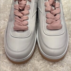 Step out in style with these Chanel women's sneakers, featuring a chic white design accented by pink laces. Perfect for adding a touch of elegance to any casual outfit.