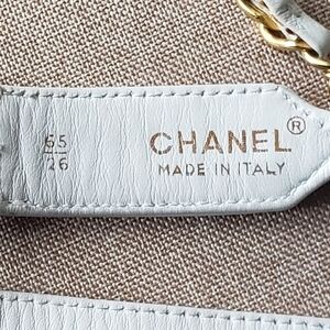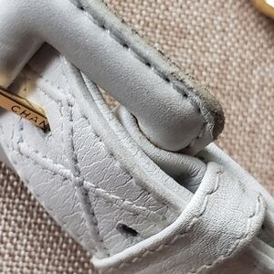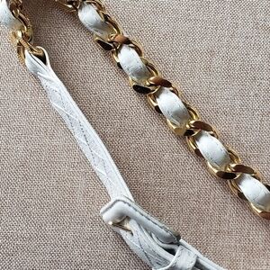 chanel authentic white leather belt with chanel charm logo. 3 holes but room for few more if you need. thick gold chain. beautiful for chanel lovers. always perfect for a dress slacks or dress up your favorite jeans. made in Italy. few areas show signs of use but overall belt is beautiful and after all its Chanel where it will catch every one's eye.