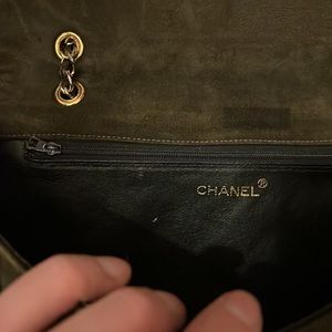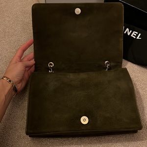 Olive Green suede quilted Chanel bag, pre-loved and worn with tons of life left. Measure 8”h, 11”l, 2.5” deep- 10” strap drop doubled, 18” singled