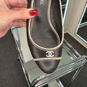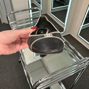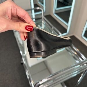 Black leather with a cream trim/stitching, white metal logo, round toe