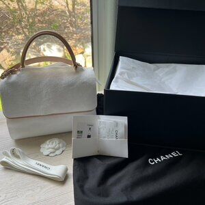 It is in excellent condition. Barely wore it out. All four inside protective stickers are intact. Bought from the Chanel boutique in Topanga California. Comes with tag, dustbag, ribbon, camelia, box, care card, protective felt original tissue paper etc. This is a lambskin- soft but has a durable feel to it. With the natural characteristics of this particular season's leather, it feels extra durable- doesn't scratch easily. Mine does not have any scratches. If you scratch it lightly with a nail accidentally, just rub it and it will go away. It came with a little bit of natural crease of leather on the bottom. but it never grew or got deeper. It is the way this leather creased when making the bag.