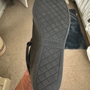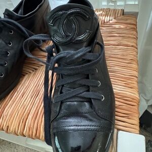 Chanel black athletic shoes in black with a black patent toe and large patent CC logo on tongue of shoes. Excellent condition! Original price was $980 asking $350. Sz-8 1/2