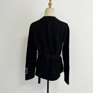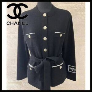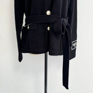 This Chanel black knit cardigan is the perfect embodiment of classic elegance and luxury. Crafted from soft, comfortable fabric, its simple yet sophisticated round neckline is complemented by exquisite metal buttons, each radiating a sense of opulence. The symmetrical chest pockets blend beauty with practicality, while the waist tie allows for customizable adjustment, creating a sharp yet graceful silhouette. The distinctive embroidered detail at the cuffs serves as the crowning touch, showcasing Chanel's masterful craftsmanship and signature style. From the fabric to the intricate details, every element highlights Chanel's timeless silhouette and luxurious taste, making this an indispensable elegant piece for any wardrobe.