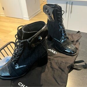 Never worn, got as a gift but too small on me! They are tweed with patent leather cap-toe, lace-up boots with outside pockets. I no longer have the box but they come with original dust bags.
