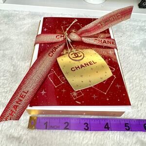 Chanel small gold box, red greeting/ gift card and matching gold gift tag with ribbon