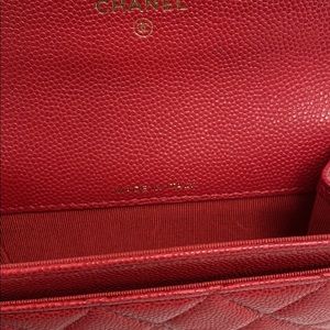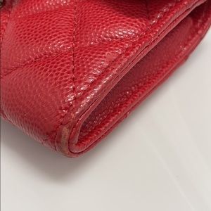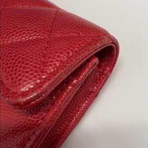 Caviar leather with quilting red chanel flap wallet. Back pocket flap, inside has one card slot and one pocket. Comes with original card certificate of authenticity. Color is 19b I think. Minimal signs of wear on the corner, hardly noticeable unless you really zoom in.