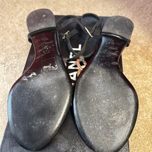 Chanel black sandals with gold chain link and ankle strap. Size 7.5. Some wear on bottom soles. In good condition. Really pretty on and dresses up any outfit. Original box.