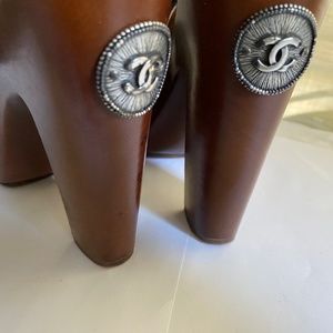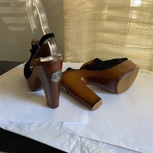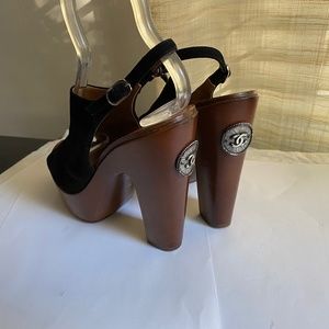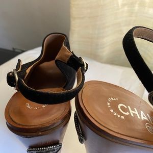 Chanel clogs 7.5 black suede adjustable ankle strap brown clogs platform