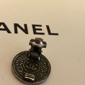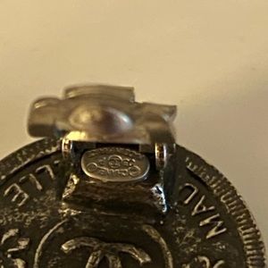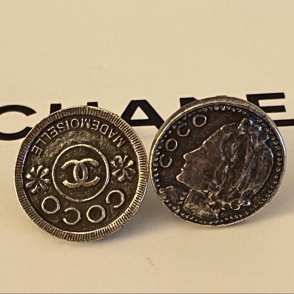 Authentic pre-owned Chanel CC earrings. Clip-on silver plated 03p France accessory 01EY646. Series number 07v. Made in France W 0.9’ x H 0.9’ xD 0”. Gently used. 100% Authentic. Each coin is double sided with one side having the classic Double C logo and the back has madam coco Chanel’s face on it. One of the clasps is looser than the other but can be adjusted.