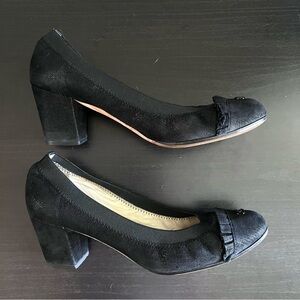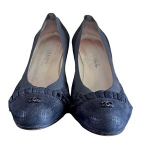Chanel heel ballet elastic ruffle toe logo CC black shiny suede 36.5