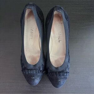 Chanel heel ballet elastic, ruffle toe, logo CC black shiny suede 36.5.