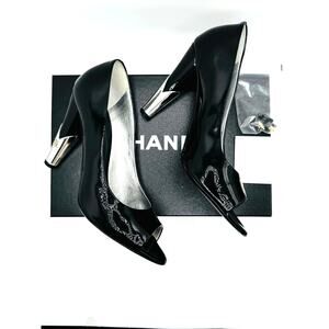 These Chanel black patent pumps with silver-tone heels and the signature logo detailing are a stunning pair. The peep-toe design and glossy finish make them a versatile yet statement piece.