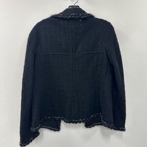Black thin tweed with a cream ribbon and glitter thread trim, open with closure, Chanel buttons on the pocket, pointed collar