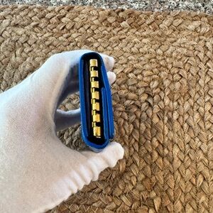 Color: Blue, repainted with Angela’s leather paint and finisher a pearl bracelet has been added so you can wear it on your wrist and a rivet.