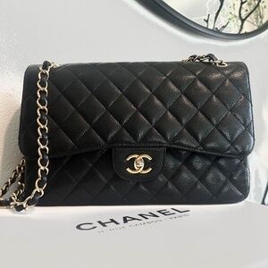 Like new! Chanel classic large double flap caviar bag with gold tone metal. Bought a little over a year ago in Paris. Receipt and authentication certificates are attached. No rips! The only sign of wear is on the outside pocket when I kept my phone. Has a few scratches on the inside of that outside pocket. Sells for $11,700 in Chanel stores( plus tax)