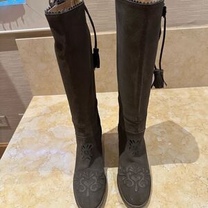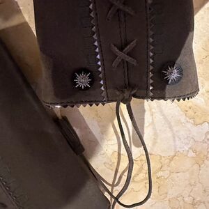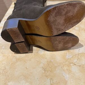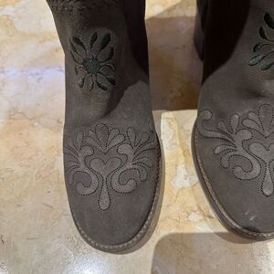 Chanel Olive Brown suede boots. Side, lace up detail with leather lacing, and black jewel detail Chanel logo on side of boots super gently worn and perfect condition. Size 41 made in Italy. No scratches or scuffs. Absolutely beautiful. He’ll hide us 2 inches and the height from the top of the sole of the heel to the top of the boot is 15 inches.