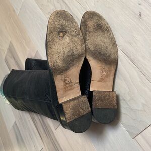 Stunning and 100 percent authentic Chanel boots. Black pebble leather, silk lined shaft, 1.5” heel height. Flawless, zero odors or issues anywhere. I wore them only 3 times. Outsoles show a little staining. See heel and toe photos and zoom in to see the immaculate condition they are still in. My loss… they are perfection. My feet grew and they just don’t work for me now. Size is 41- a true size 10 but could work for a 9.5. Reg width. So flattering. Big CC logo on back of top shaft. See all pics these are perfection!