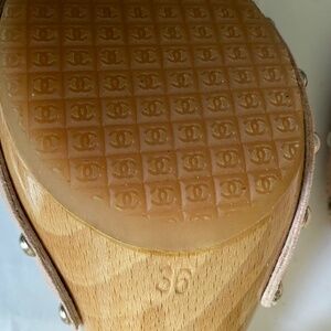 CHANEL PINK suede LEATHER MULES WITH cute TAN WOODEN CHANEL LOGO CC BUTTON ON silver adjustable BUCKLE.