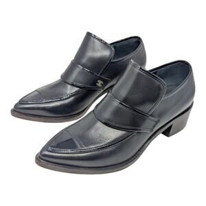 Chanel pointed toe loafers black leather chunky heel interlocking CC logo 36C