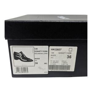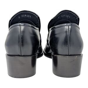 Chanel loafers with chunky block heel and high vamp in black leather with patent leather accent at toe, size 36. (C is wider than a B, which is Chanel medium and tends to run narrow.) In excellent preowned condition with minimal signs of wear such as scuffs to soles and light wear to uppers. Includes original box.