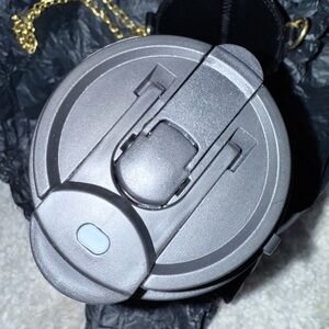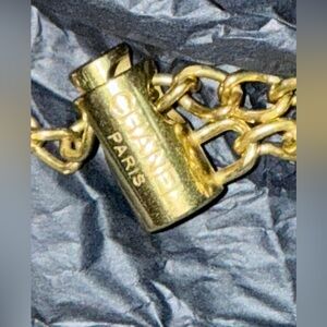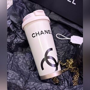 Elegant black quilted holder with iconic gold chain .cup is the white model. Comes with straw and lid and detachable “coffee” hanging tag. Comes new in Chanel box. Authentic Chanel VIP item.