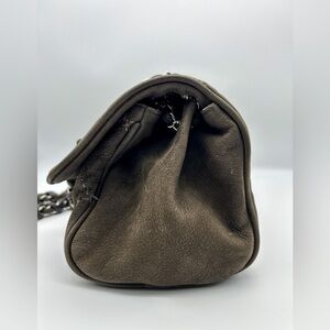 Chanel timeless flap bag grey suede silver hardware with card. 100% authentic. Slouchy and easy. Look at photos. Signs of use throughout. Minor color transfer on strap and a couple places where stitching has come out. No rips no tears, no smells, no smoke, no pets. Not crossbody. Only shoulder