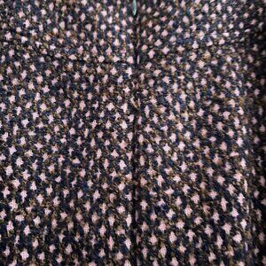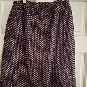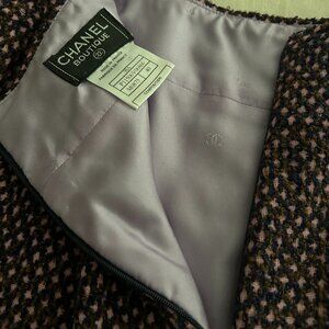 This is a beautiful Chanel Boutique skirt in wool with a silk lining. Double C is imprinted in the lining. Please see the tag in the picture for exact material: 54% wool, 16% silk, 15% nylon and 15% mohair. The lining is 100% silk. The color is purple with black and purple diamond.