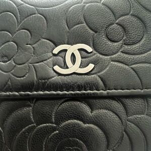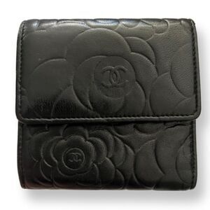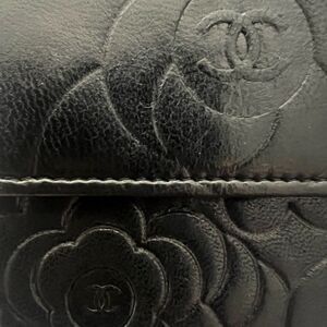 Chanel Black Lambskin Camellia Embossed Short Trifold Wallet