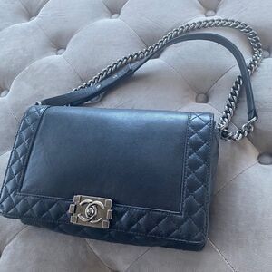 Chanel calfskin Medium Boy Reverso bag. soft black calfskin leather exterior with quilted borders. chain handle with a leather shoulder rest and silver-tone CC logo twist lock closure on the front. The fabric lined interior houses two open pockets.