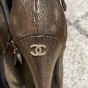 Chanel cap-toe metallic leather high-heeled ankle boots with two zips one on either side and an embellished brand logo on the heel.