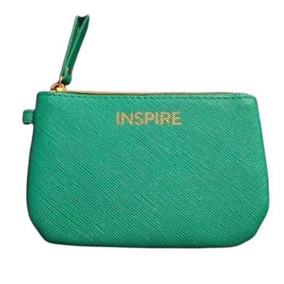 Change purse that says INSPIRE on the one side. Inside has a zippered compartment and slots for credit cards and ID