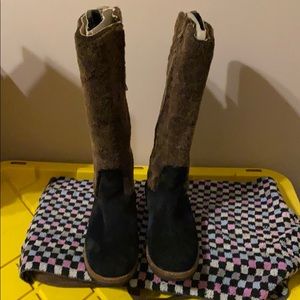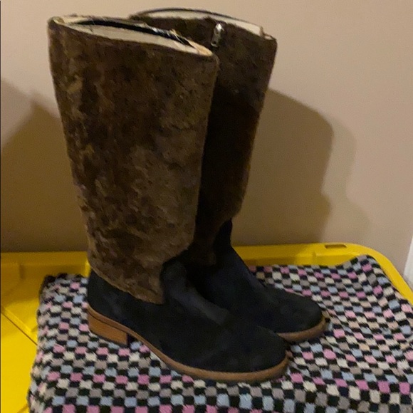 Black Suede with brown Fur Tall UGGs very comfortable . With gold medal UGG at the base of heel of the boot.