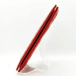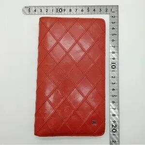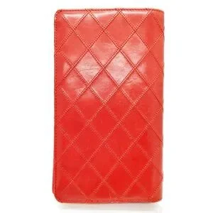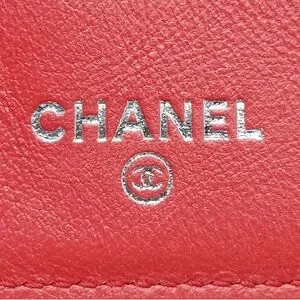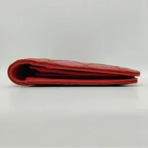 Compact CHANEL wallet in bold red leather. Quilted texture with stitched detail. Silver embossed CHANEL logo on front. Polished metallic logo accent.