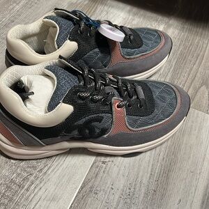 Channel authentic tennis shoes. You’ll look great in these stylish channel shoes! Talk about compliments from people! They are used but in great condition! There is a small scratch on it but other than that it looks great!