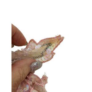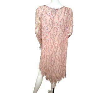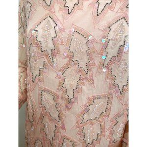 0904A- Chanson D’Amour Women’s Dress Vintage Midi, Sequins, Beads, long sleeve, leaf pattern, pink, peach, Iridescent sequins, grey beads, Handmade in India. 100% pure silk, dry clean only, Pullover, 100% Shell lining , pointy hem in middle. Handkerchief hemline. Round neckline. See-through overlay. Sparkly, party:cocktail/wedding, glam, retro,, 17” shoulder to shoulder, 41.5” armpits, 39.5” waist. 40” hips, 45” long, 22.5” sleeves, 9” wrist opening.