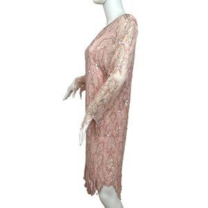 Chanson D’Amour Silk sequins Beaded Dress XL Midi Pink Peach Vintage Long Sleeve
