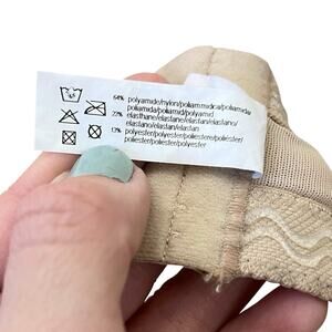 Strapless bra. Underwired. Lightly lined molded cups. Has slots to add optional straps, but I don’t have any straps to provide.