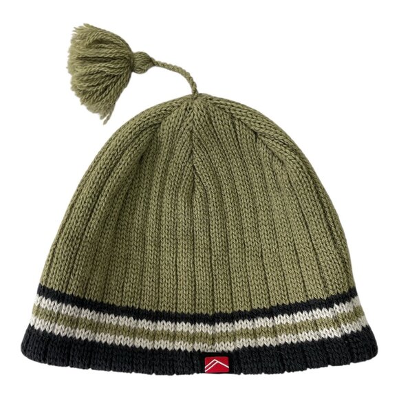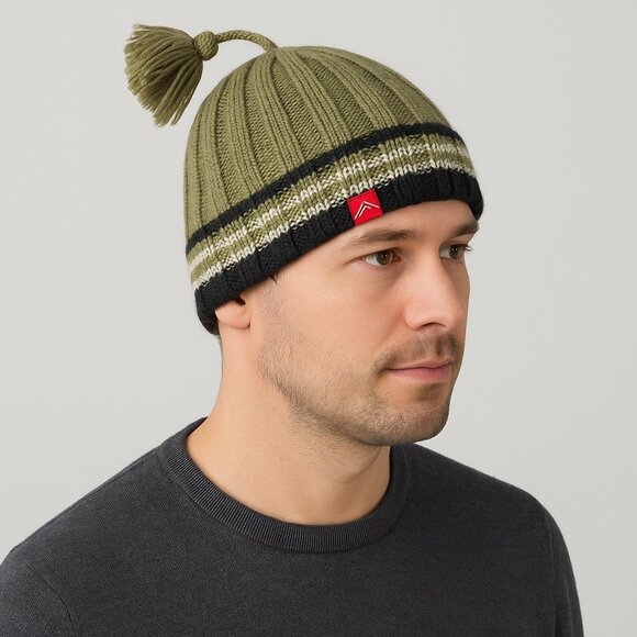 Warm and timeless Chaos wool beanie crafted in Canada. This ribbed knit hat features an olive green body accented with cream and black stripes along the brim and a fun tassel at the top. Soft, insulating 100% wool construction offers excellent comfort for winter weather or outdoor activities