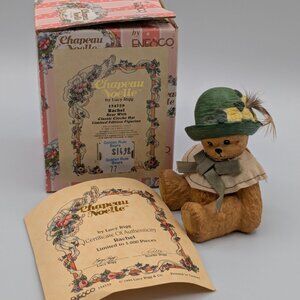 Charming limited edition Chapeau Noelle Rachel bear figurine (134759) from 1994, designed by Lucy Rigg. Features a sweet bear wearing a classic cloche hat. Pre-owned and in excellent condition. Includes original Certificate of Authenticity. Box shows wear due to age and storage, including a tear on the top.