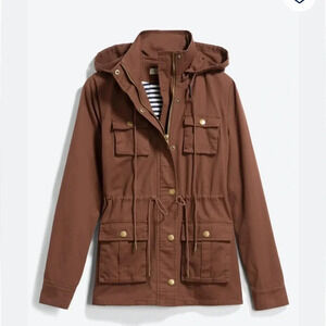 Worn at most 2-3 times. In excellent condition. Size XL. Truest color is the stock photo. Functional chest and front pockets. Snap and zipper closure. Has a detachable hood. Waist ties to accentuate waist. Navy blue and white striped lining.