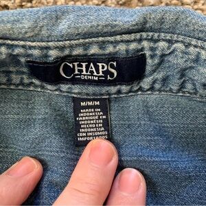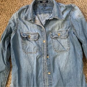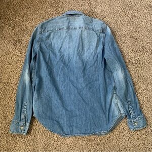Classic denim shirt with button-up front. Features two chest pockets. Long sleeves for versatile styling. Preowned condition - excellent.