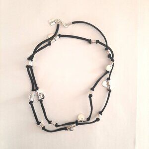 A Chaps black cord necklace with silver-tone hammered metal accents and beads/discs spaced along its length. This necklace can be worn layered or in its long format. The closure is a lobster claw type. Measures approximately 35 inches in length. Good condition, never worn, with no flaws.