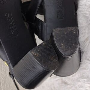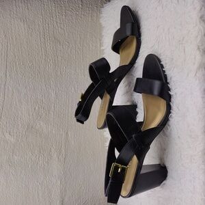 Chaps Women's Black Faux Leather Upper Almond Open Toe Five Hole Gold Hardware Buckled High Blocked Heel Slingback Sandal Shoes. Rubber Textured Sole. Cushioned Footbed. Light Footbed Marks. Footpad Residue. Heel Pad Wear. Measurement approx. Heel: 3". Size 10B Color May Vary Due To Lighting.