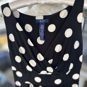 Elegant black dress with white polka dots. Sleeveless and chic design.