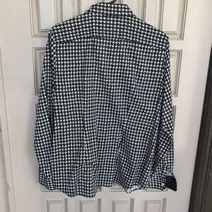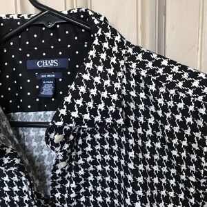 This Chaps blouse is a stylish addition to any wardrobe. With a black and white houndstooth pattern, it's perfect for those who want to make a statement. The collar and cuffs add a touch of sophistication, while the lightweight material makes it ideal for any season. The size is XL, and it's designed for women who want to look their best. The blouse is pre-owned, but it's in great condition.