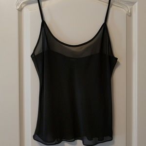 This sheer blouse is black, blue, and white with front pleats. It has 3/4 length sleeves with ruffles. A black camisole is included. It also buttons in the front and has a tie. Excellent Condition.