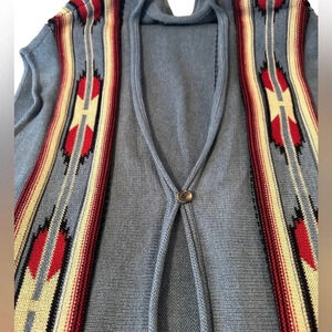 Chaps Blue Sleeveless Southwestern/Aztec Cardigan Sweater Vest with 1 front button and 2 front pockets.