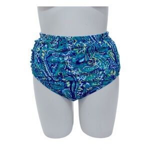 Experience the vibrant allure of the Chaps bikini, featuring a high-waisted design with ruched sides and a lively paisley print in shades of blue and green. The swimwear offers excellent coverage and a classic cut, crafted from a stretchy material with a subtle sheen for a comfortable fit.