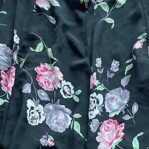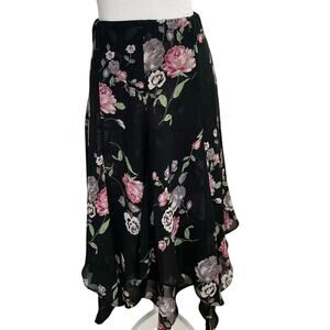 Chaps floral skirt featuring a black base with pink, gray, and white flowers. Designed with a flowy handkerchief hem for a flattering, feminine look.