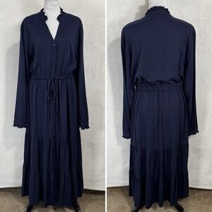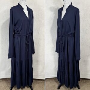 Chaps Boho Tiered Maxi Shirt Dress Size XXL Navy Blue Tie Waist Cottage Prairie
